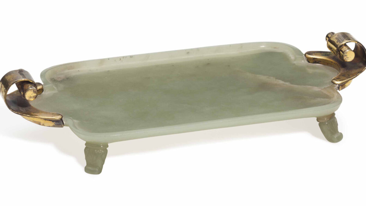 A GILT METAL-MOUNTED CHINESE PALE GREEN JADE DESK ACCESSORY
