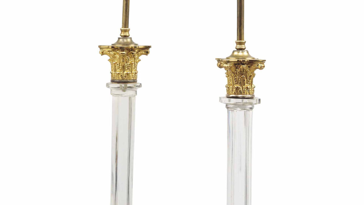A MATCHED PAIR OF GILT BRONZE MOUNTED GLASS COLUMN TABLE LAMPS 20TH CENTURY The Corinthian capitals above hexagonal shafts on stepped bases 18 in. (45.7 cm.) high excluding fitment